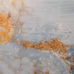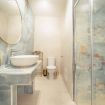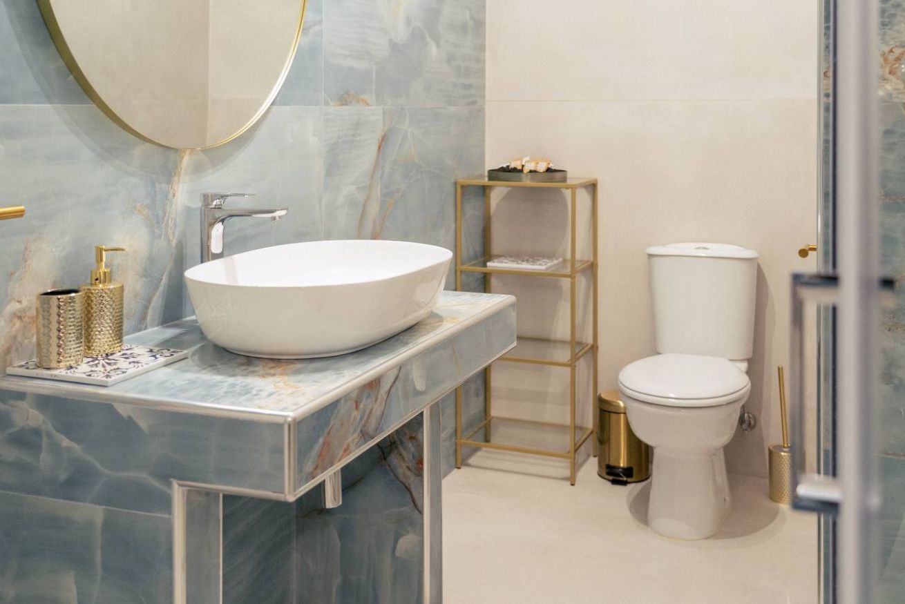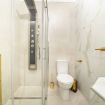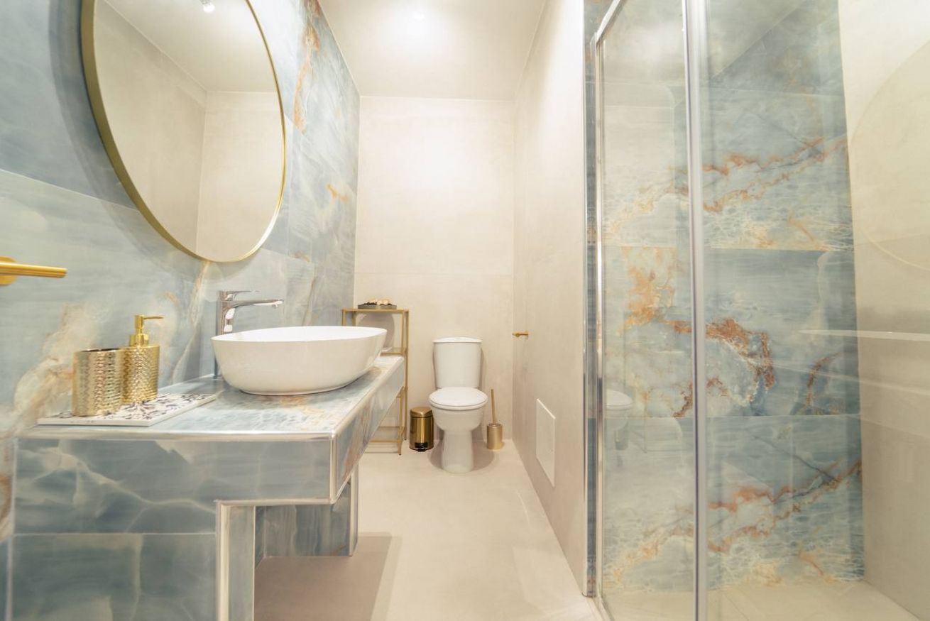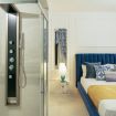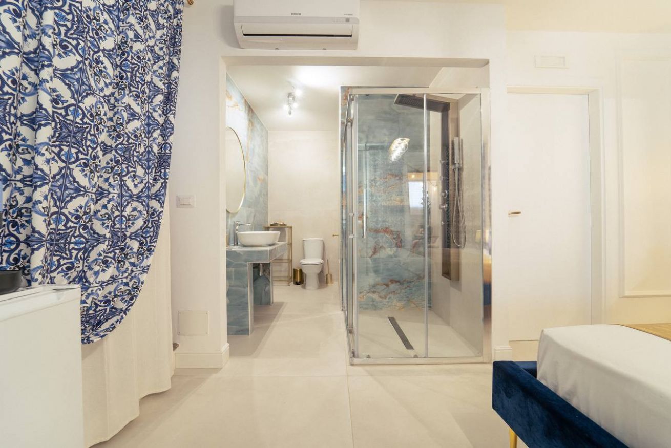 En-suite bathroom: Glossy blue marble finishes, hydromassage shower panel, gold details, and fresh towels.
