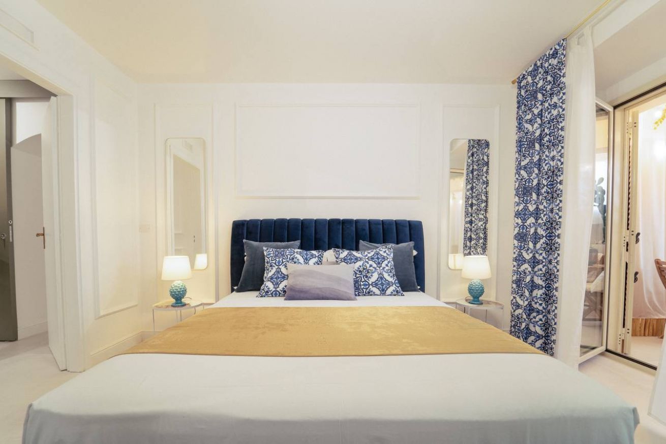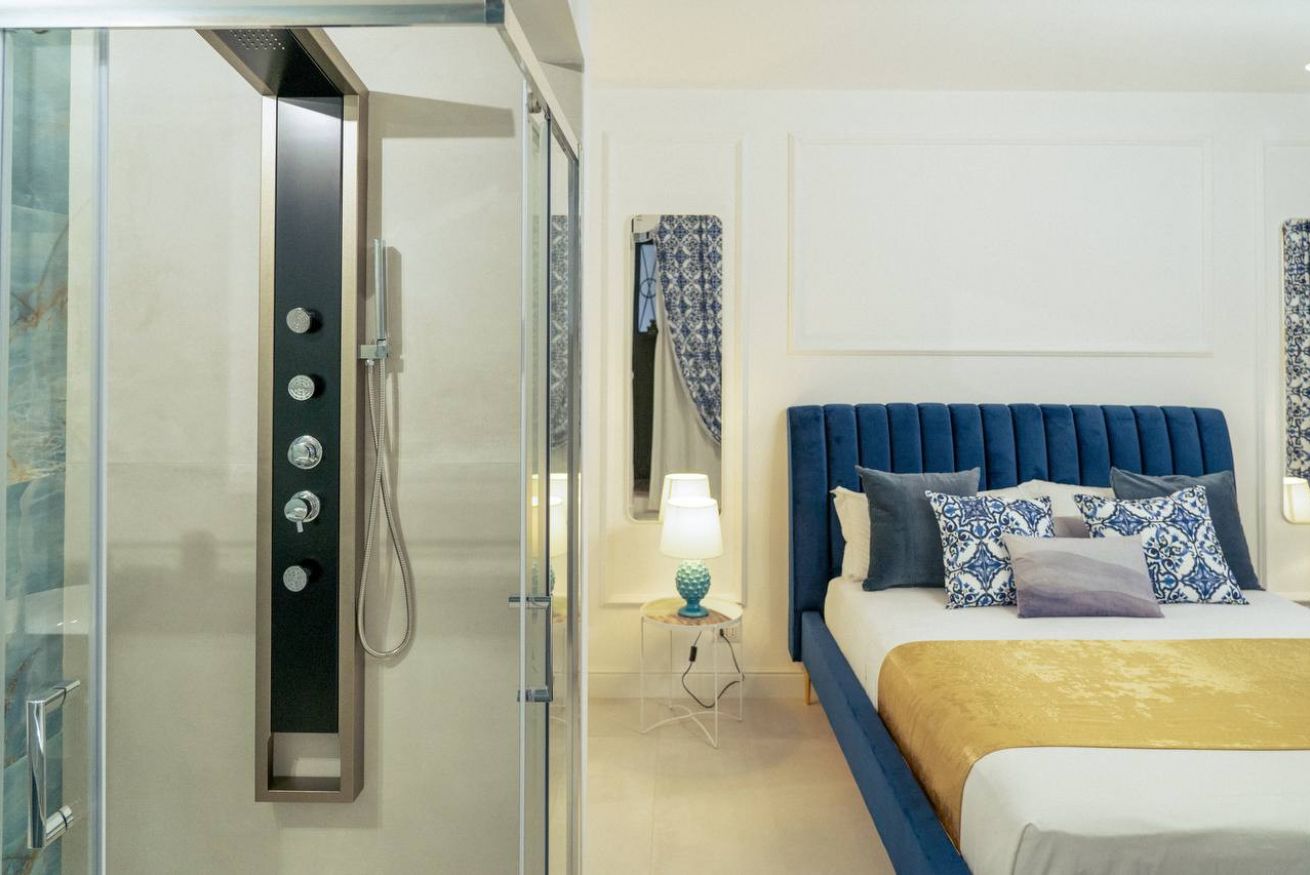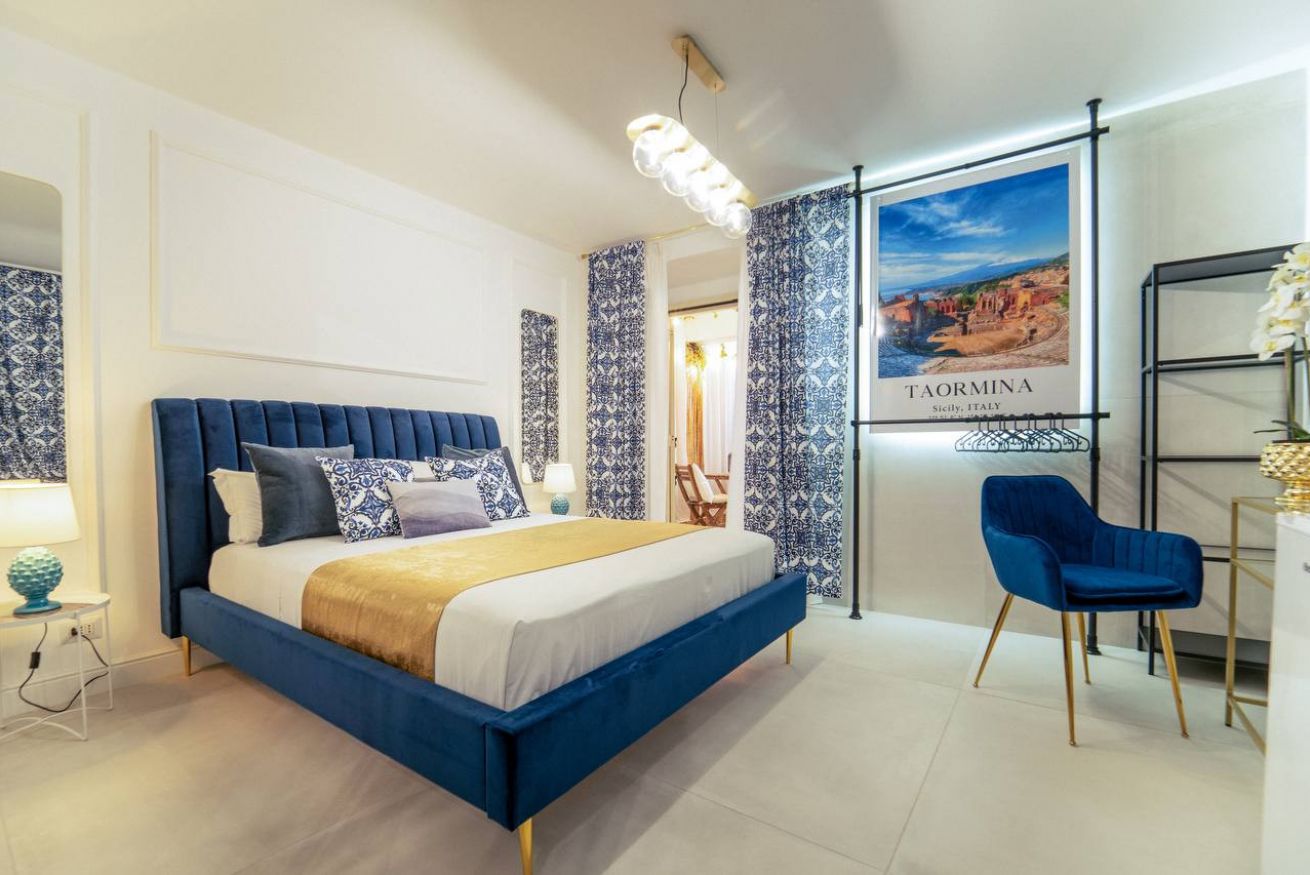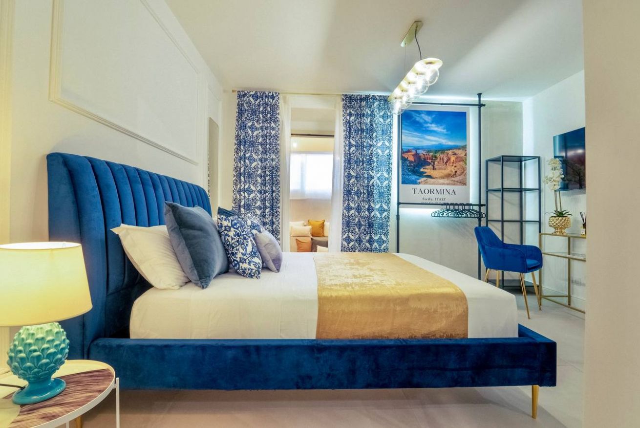 The timeless charm of Sicily meets refined design in this elegant suite in Taormina, located less than 50 meters from the sea and in a strategic position to reach the historic center thanks to a shuttle that stops just steps away. Crisp whites, ceramic-patterned blues, and velvet textures create a calm, elevated atmosphere.