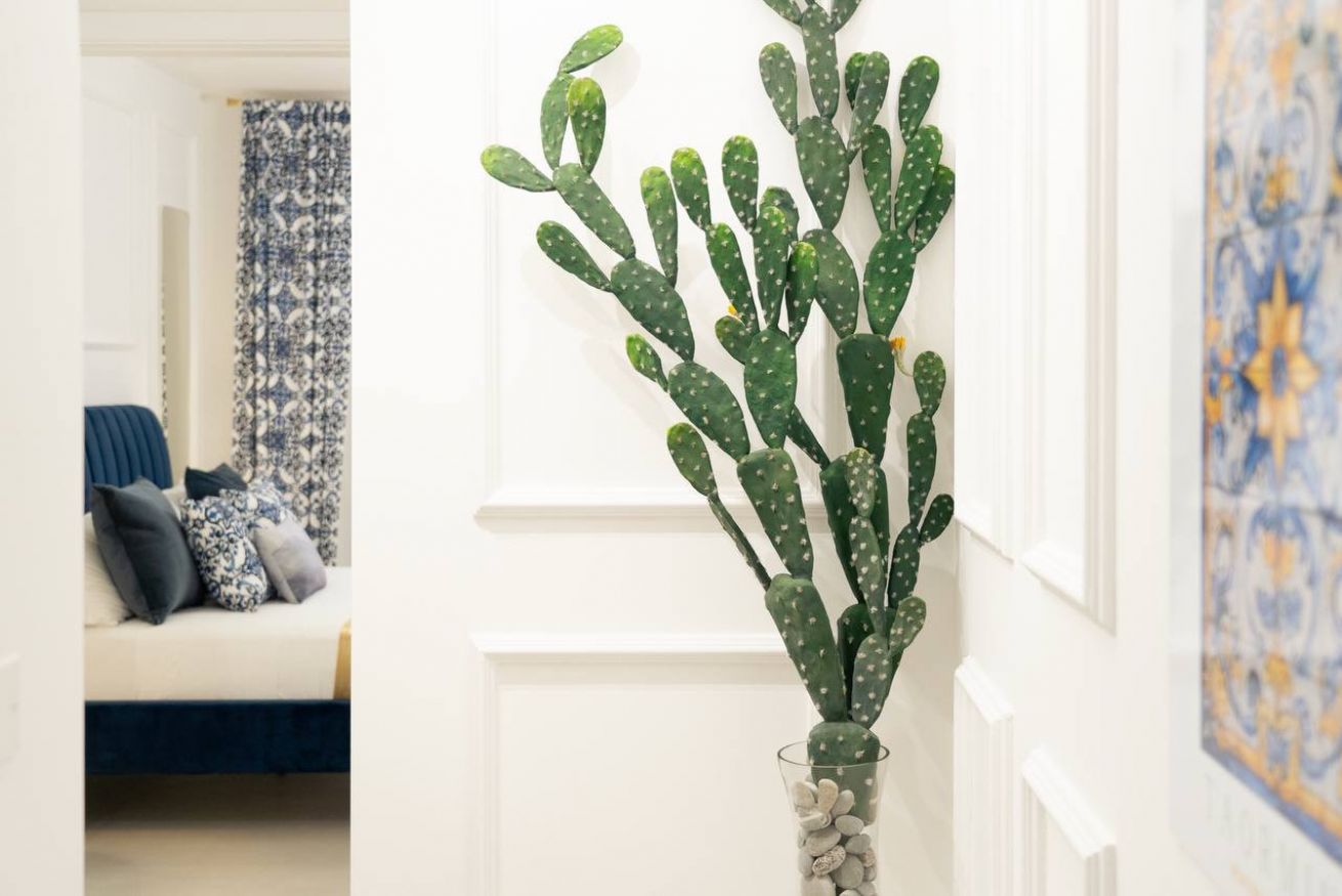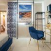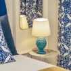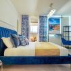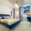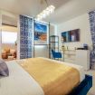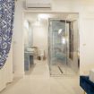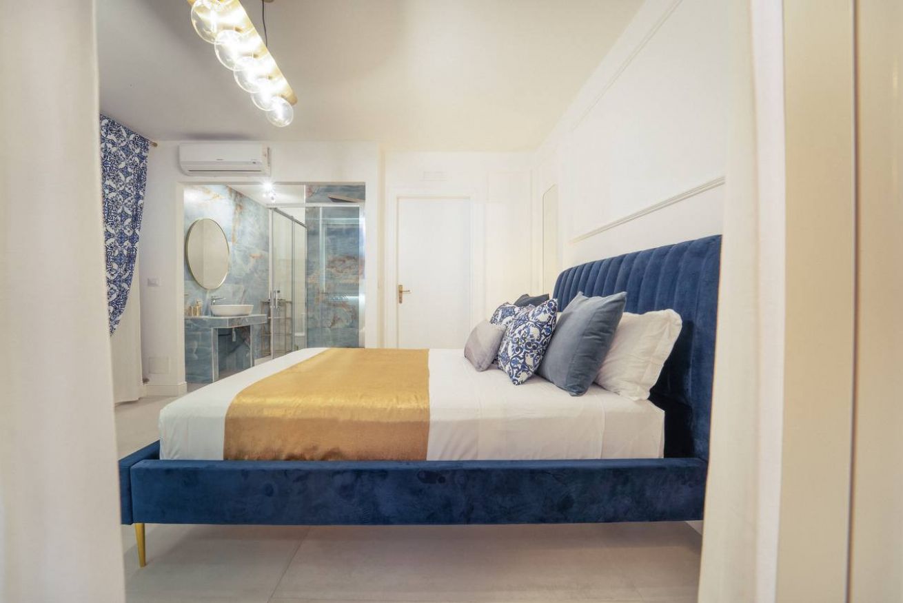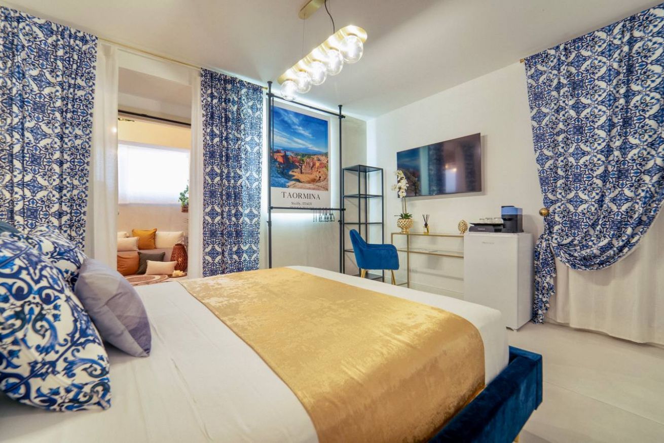 The timeless charm of Sicily meets refined design in this elegant suite in Taormina, located less than 50 meters from the sea and in a strategic position to reach the historic center thanks to a shuttle that stops just steps away. Crisp whites, ceramic-patterned blues, and velvet textures create a calm, elevated atmosphere.