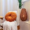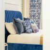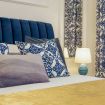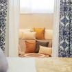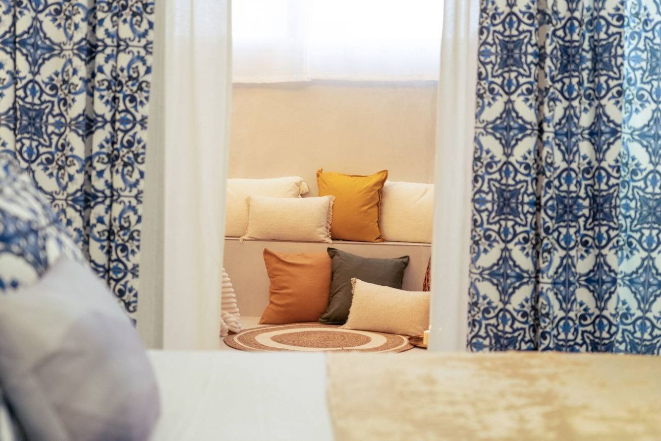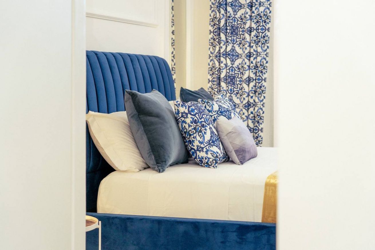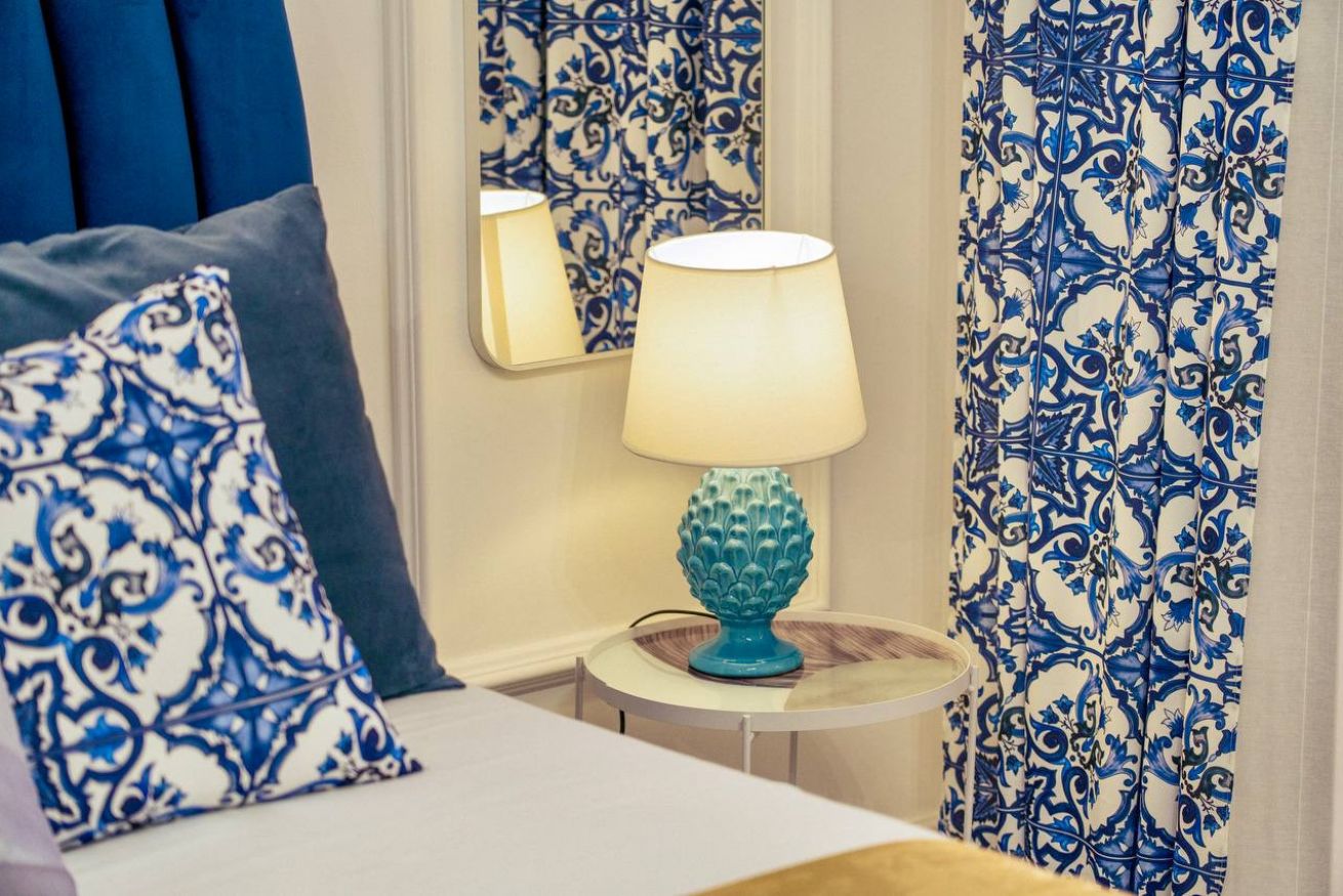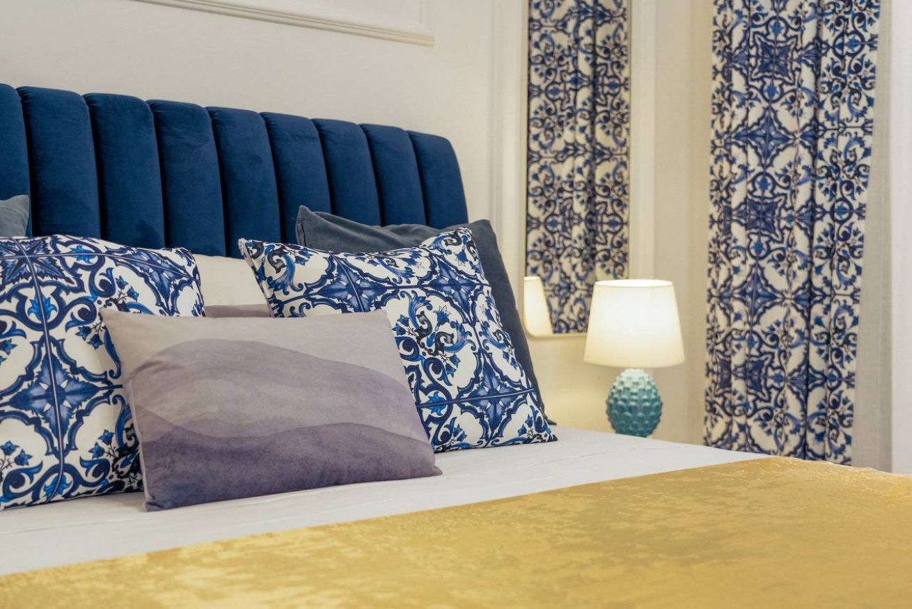 Bedroom: Velvet double bed, layered pillows with Sicilian ceramic patterns, soft lighting, and blackout curtains.
