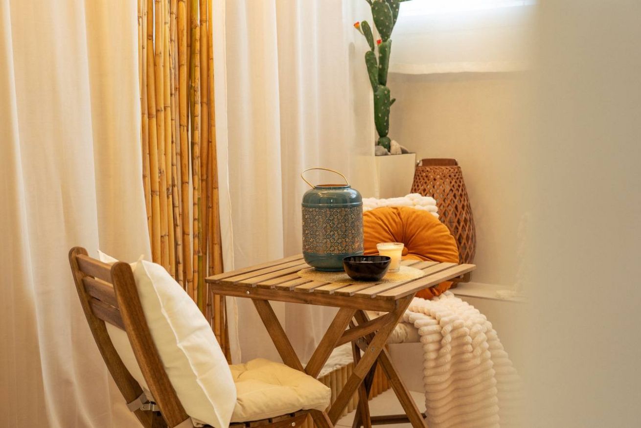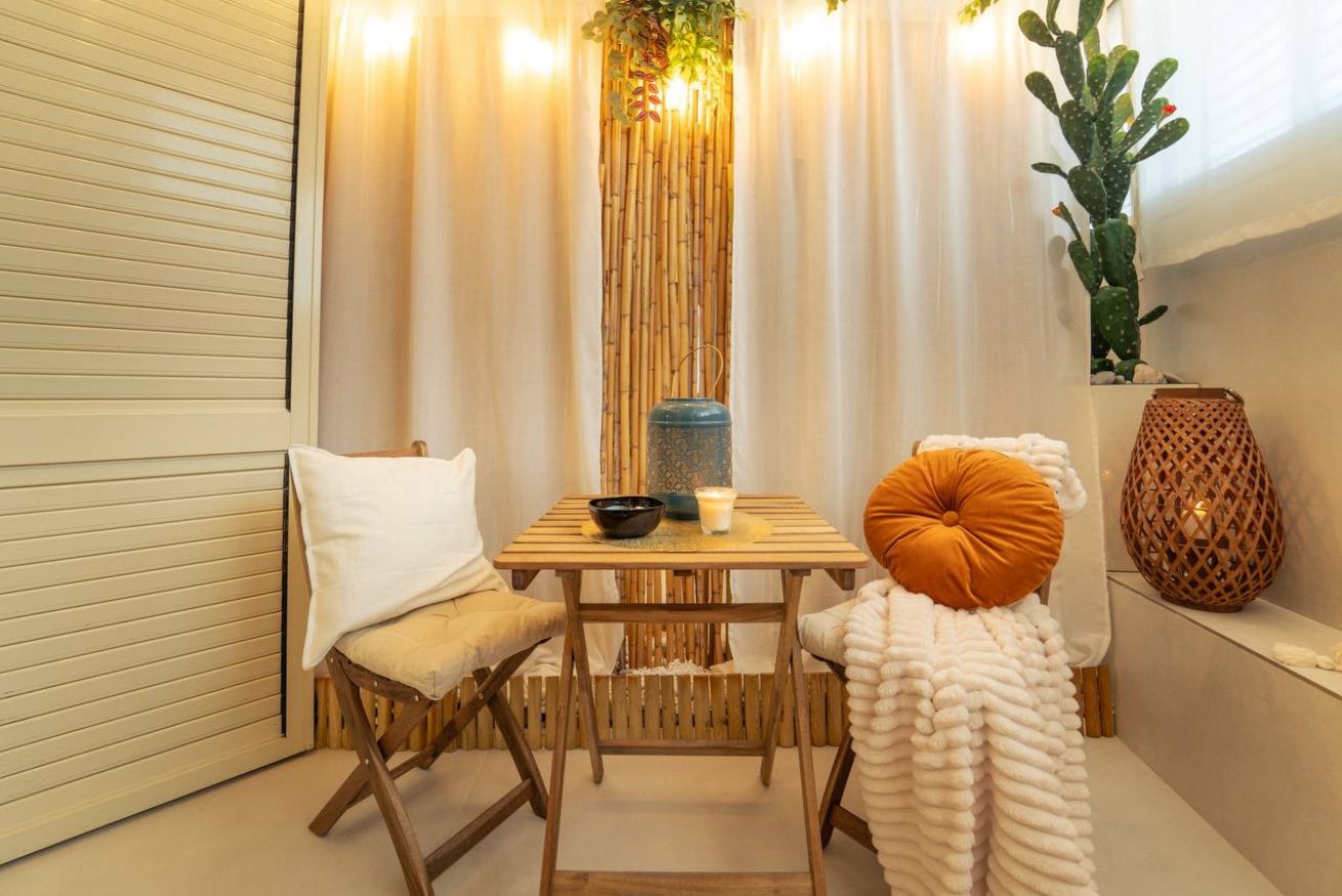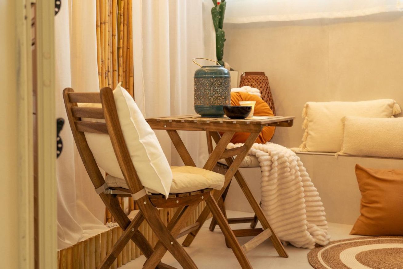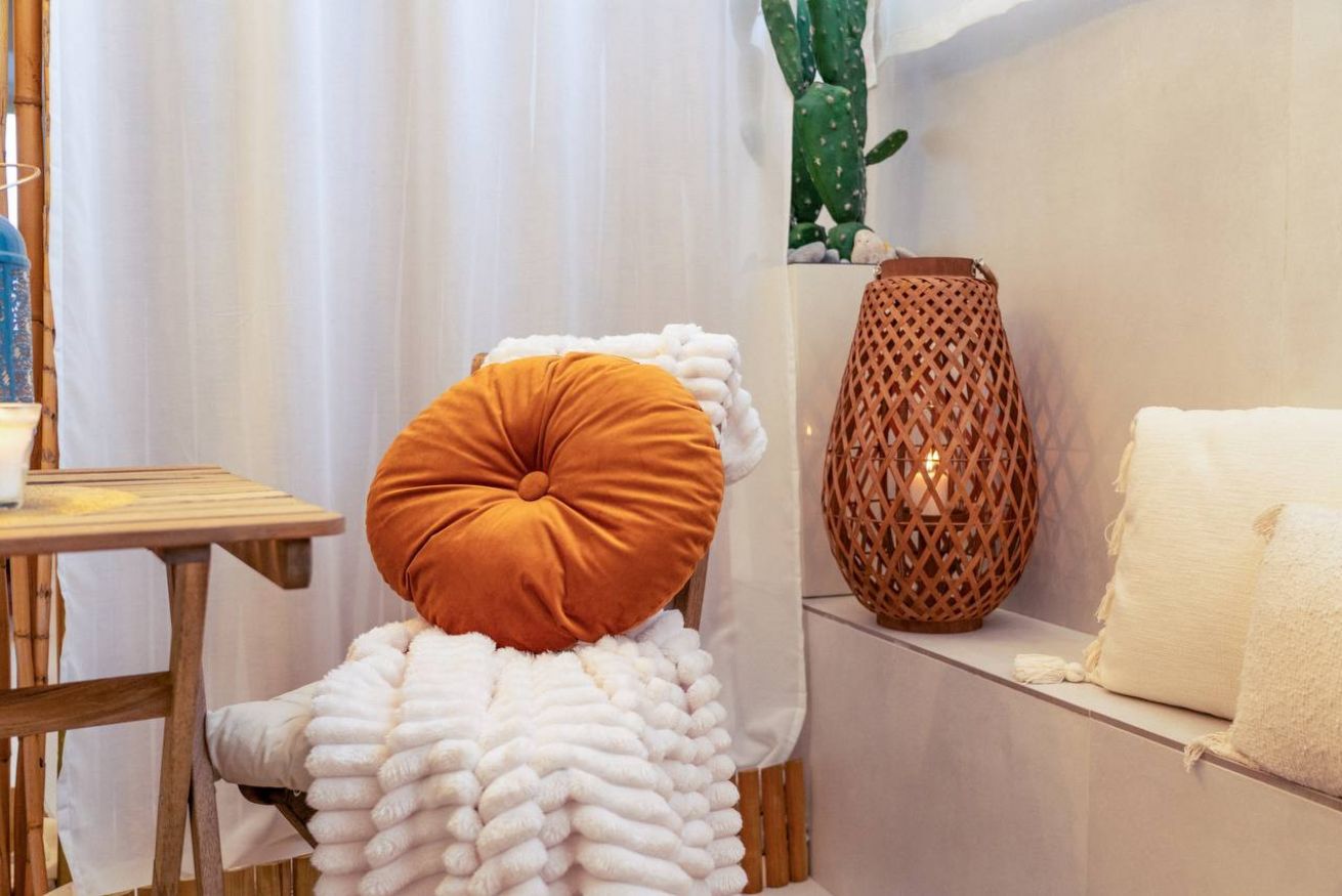 Indoor lounge: Guests can enjoy a serene bamboo-scented relaxation corner with soft cushions, candles, natural textiles, and a small bistro table—perfect for reading, sipping wine, or unwinding after the beach.