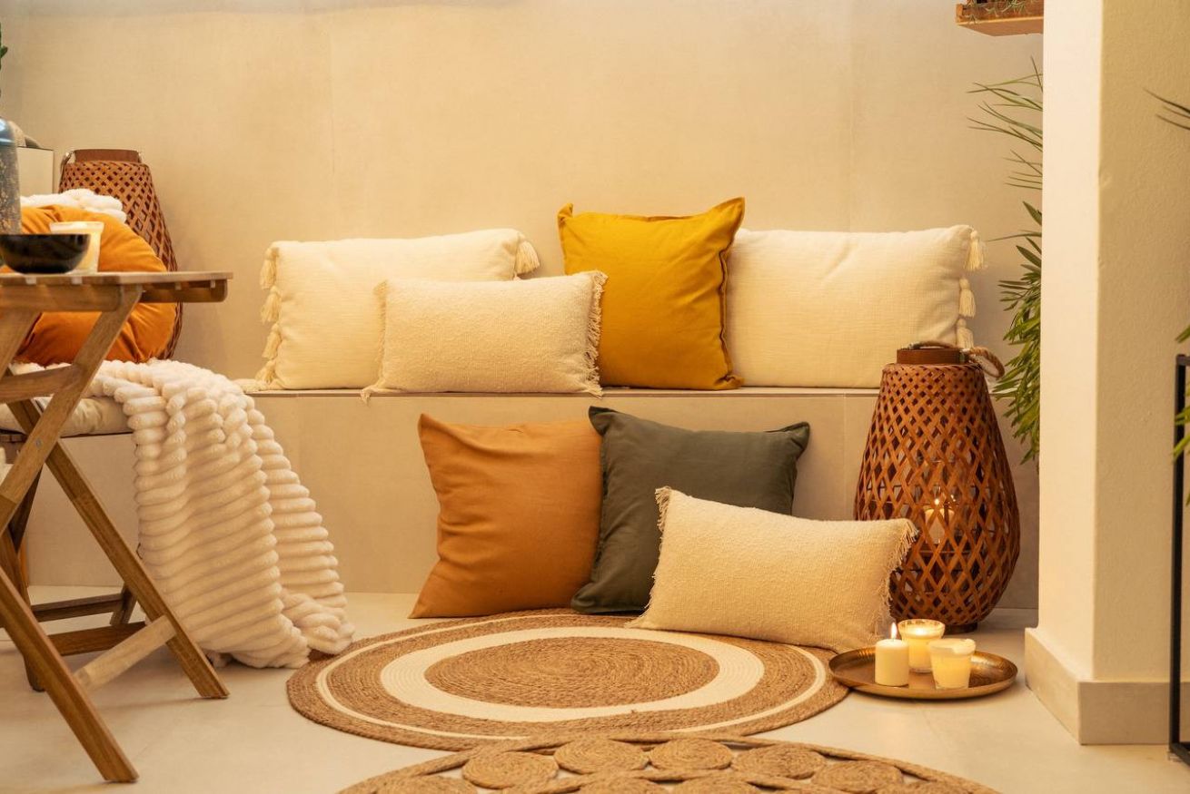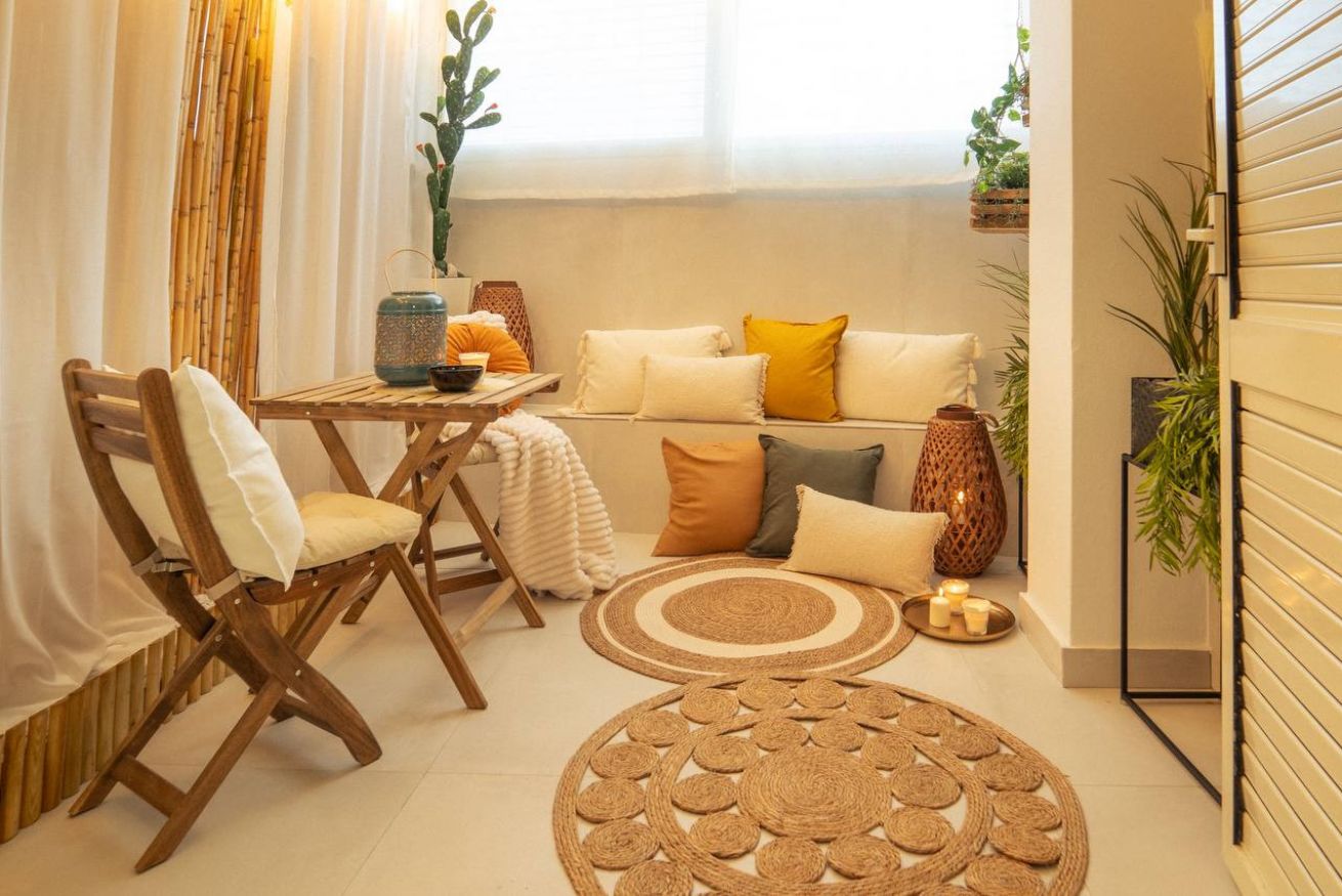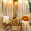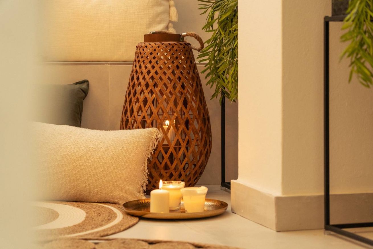 Indoor lounge: Guests can enjoy a serene bamboo-scented relaxation corner with soft cushions, candles, natural textiles, and a small bistro table—perfect for reading, sipping wine, or unwinding after the beach.