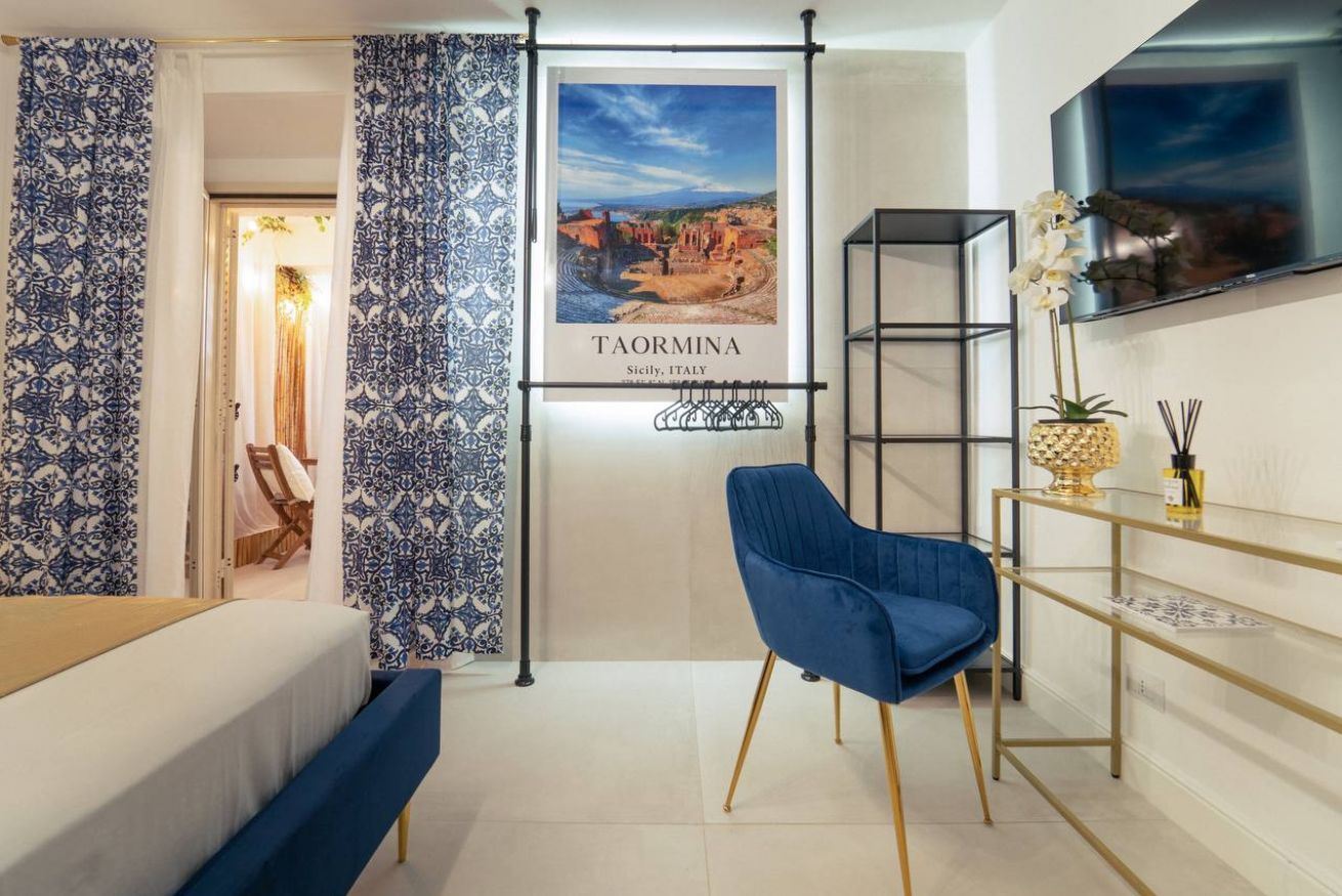 This room blends Mediterranean inspiration with modern touches, offering an elegant and welcoming base for your Taormina getaway.